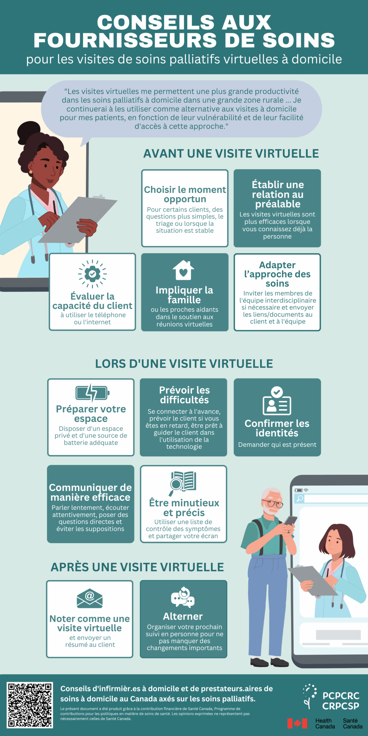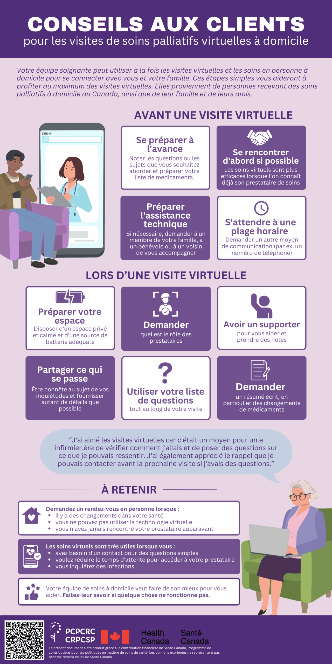 Conseils aux fournisseurs de soins pour les visites de soins palliatifs virtuelles à domicile / Conseils aux clients de soins pour les visites de soins palliatifs virtuelles à domicile
